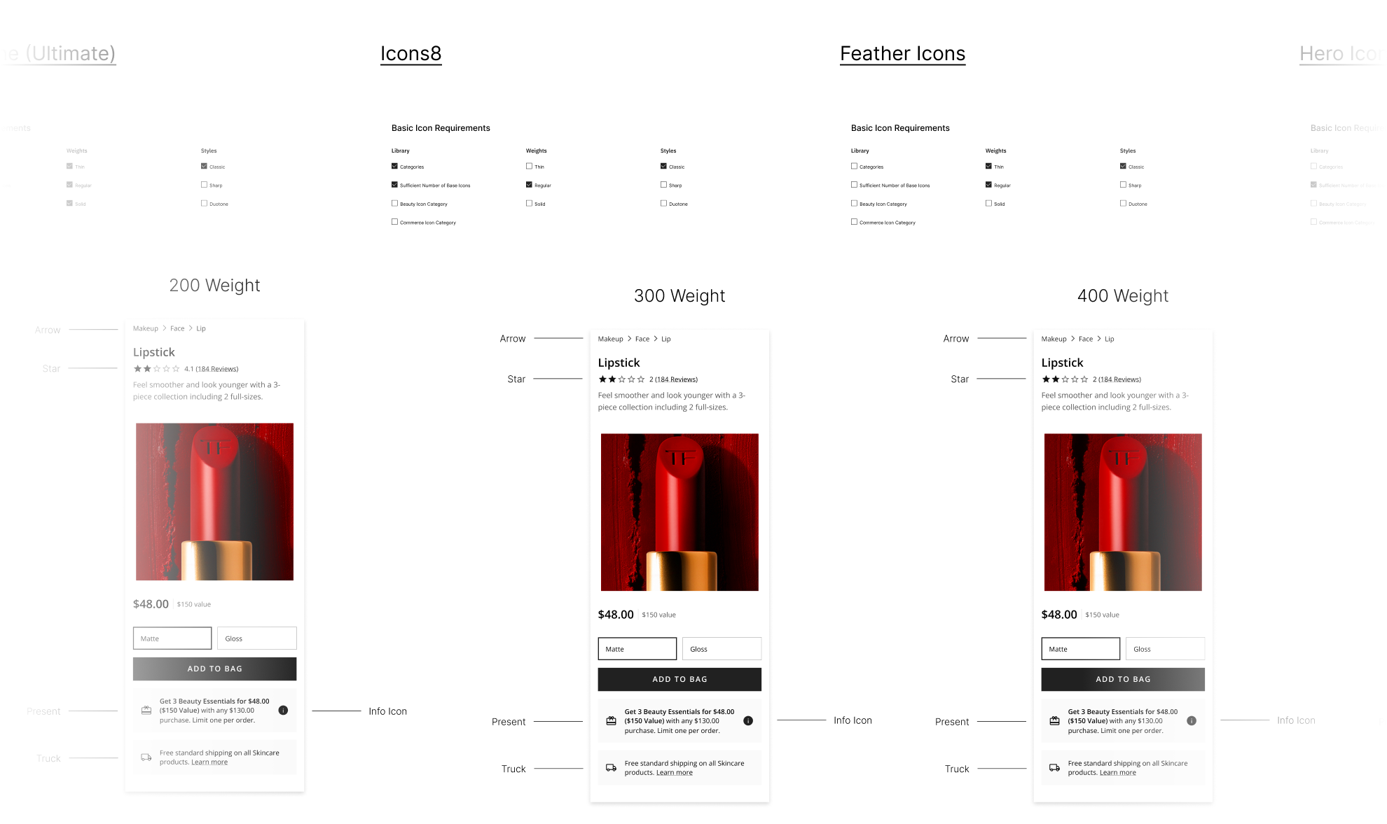 I began by evaluating several icon libraries to determine the best foundation for the enterprise. Material 3 provided the strongest starting point due to its style options (round vs sharp), weight options, and wide glyph coverage. I paired this with a custom vectorization workflow for beauty-specific icons from Icon Park.